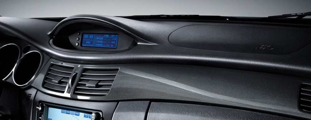 An instrument panel embellished with carbon fiber trim strips